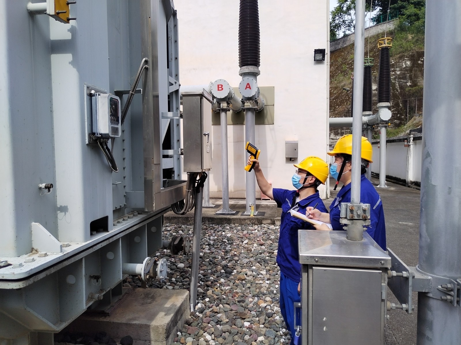 受涼山州氣候影響,較大晝夜溫差給玉田電站設(shè)備穩(wěn)定運(yùn)行增添雙重負(fù)荷考驗(yàn)?!皩幾鰺o用功,不留一隱患?!比胂囊詠?,廠長(zhǎng)孫萬慶始終堅(jiān)持每日帶領(lǐng)維護(hù)人員在中午高溫時(shí)段到廠區(qū),大壩等對(duì)電力設(shè)備設(shè)施開展帶電檢測(cè)和紅外測(cè)溫。7月11日午時(shí),1號(hào)主變C相低壓側(cè)導(dǎo)管突然出現(xiàn)輕微滲油現(xiàn)象,維護(hù)人員頭頂烈日,“汗”衛(wèi)堅(jiān)守在1號(hào)主變前,精心監(jiān)視滲油狀況,研討避峰消缺方案,中控室監(jiān)控人員加強(qiáng)遠(yuǎn)方監(jiān)視,奮戰(zhàn)9小時(shí),奮力保供電。