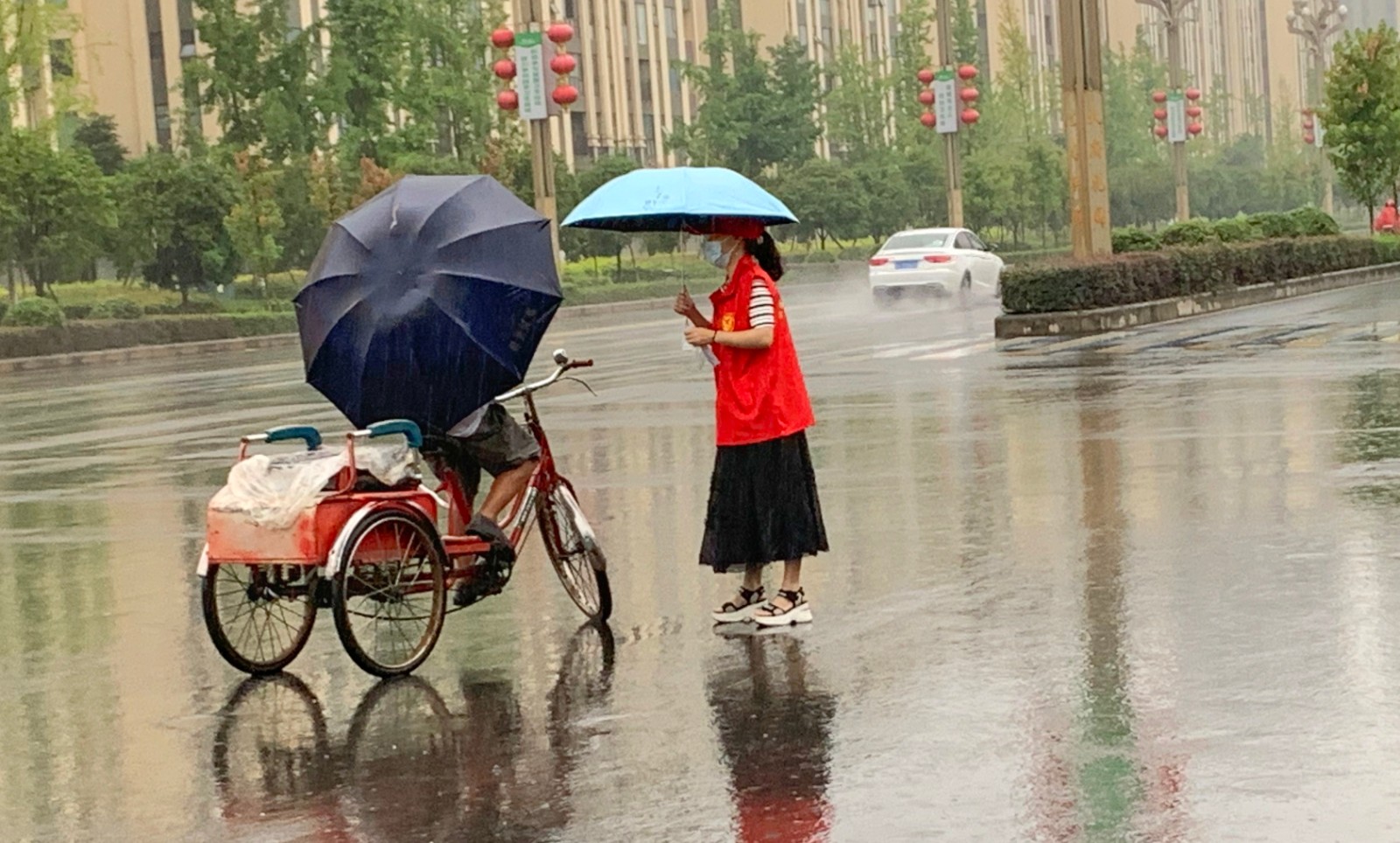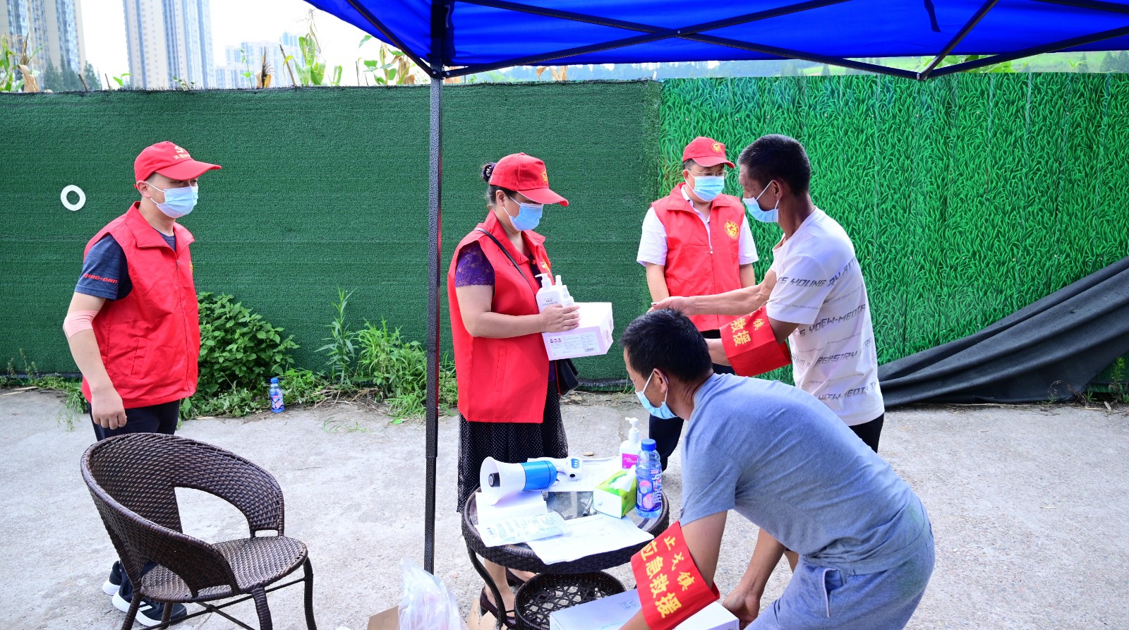 烈日高溫使豆大的汗珠從謝愛東的額頭不斷滑落,每當(dāng)其他志愿者提出換她休息時,“沒問題,我可以的”便是不變的回應(yīng)。“與家鄉(xiāng)人民一道共度難關(guān),哪怕再熱、再苦、再累都值得?!?