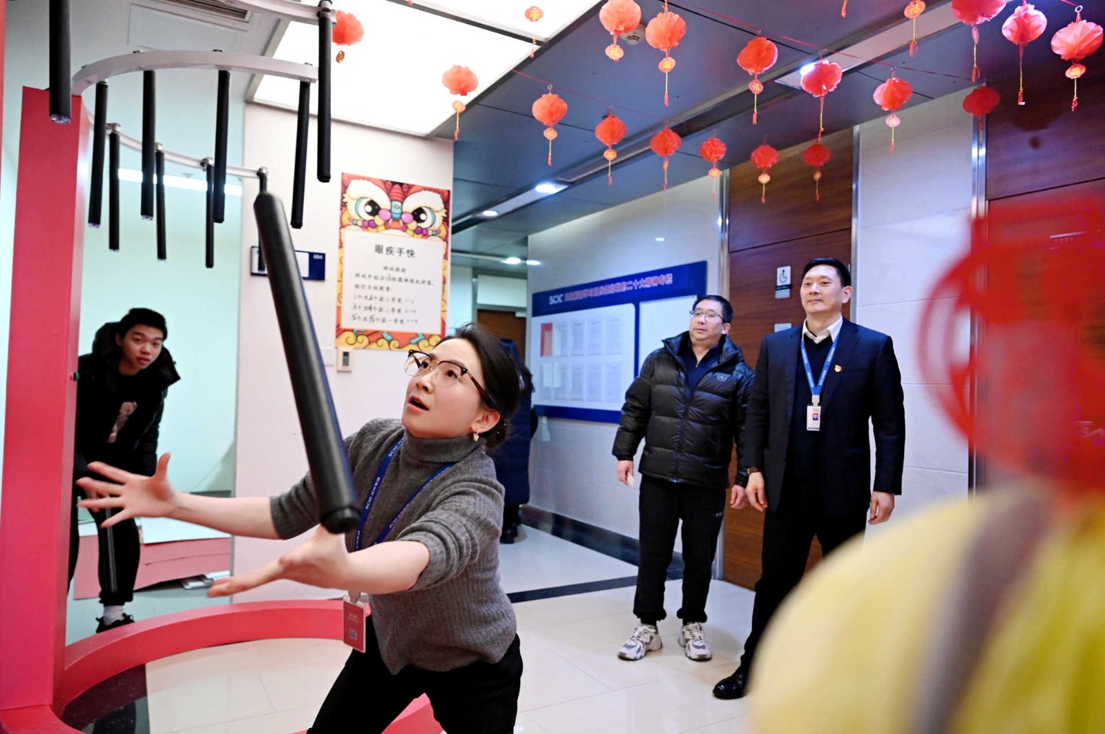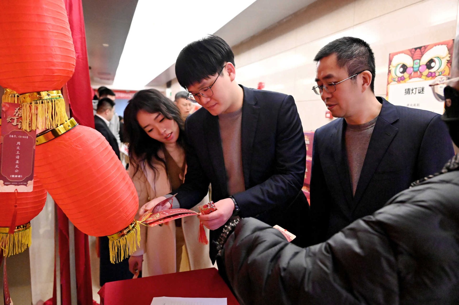 此次活動采用游園方式,現(xiàn)場設(shè)置了民俗體驗區(qū)、非遺手作區(qū)、民俗體驗區(qū)、新春互動區(qū)、游戲互動區(qū)等5個活動區(qū)域,涵蓋猜燈謎、剪窗花、做龍燈、滾滾樂等8個活動?;顒蝇F(xiàn)場每一處都用心裝扮,火紅的中國燈籠、精美的傳統(tǒng)對聯(lián)伴隨濃郁的新年味道彌散在會場的每一個角落。大家爭先恐后、玩勁十足,盡享新春的熱鬧與喜悅!有的圍著掛著紅線繩的燈謎卡片,仔細(xì)閱讀謎語,認(rèn)真思考,沉浸在猜謎的樂趣中;有的圍在四川剪紙非遺傳承人莊叢燦老師周圍,一邊聆聽著剪紙的技巧,一邊仔細(xì)修理邊角,用心精雕細(xì)琢;有的在學(xué)習(xí)制作龍燈,他們展現(xiàn)出極高的熱情和創(chuàng)造力,根據(jù)自己的想象,給龍燈增添了各種裝飾,如彩紙、亮片等,使得每個龍燈都獨(dú)具特色。