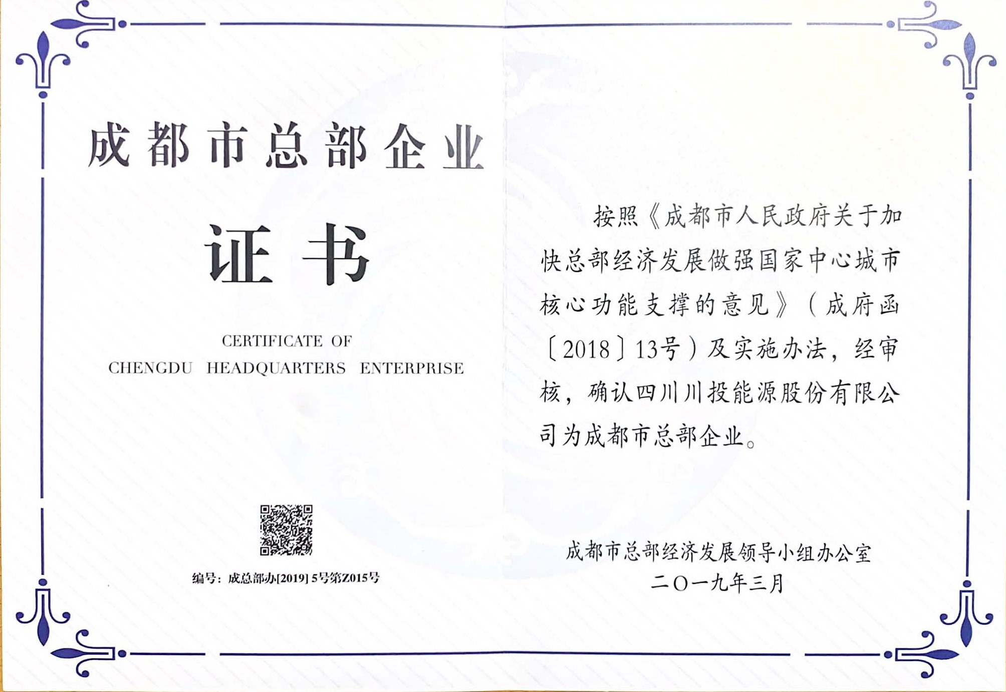 日前,從成都市總部經(jīng)濟(jì)發(fā)展領(lǐng)導(dǎo)小組辦公室處傳來喜訊,經(jīng)審核確認(rèn),川投能源正式通過2018年成都市第二批總部企業(yè)資質(zhì)認(rèn)證授牌,獲頒“成都市總部企業(yè)證書”,為2019年經(jīng)營管理工作再添亮點(diǎn)。