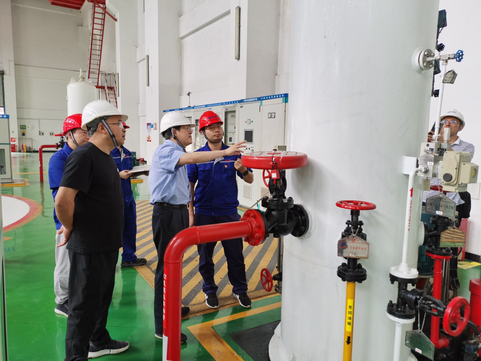 楊平一行先后前往腳基坪電站大壩及發(fā)電廠區(qū)實地檢查指導(dǎo),檢查組對大壩水庫調(diào)度情況、應(yīng)急電源保障、防汛物資儲備、閘門啟閉設(shè)備與電站的壓力容器特種設(shè)備、發(fā)電機主設(shè)備及GIS設(shè)備進行了專項檢查。