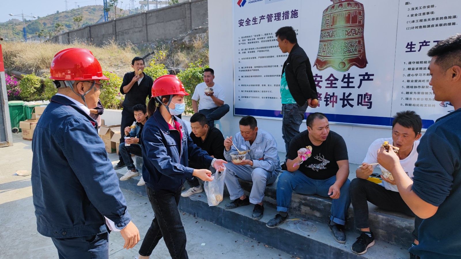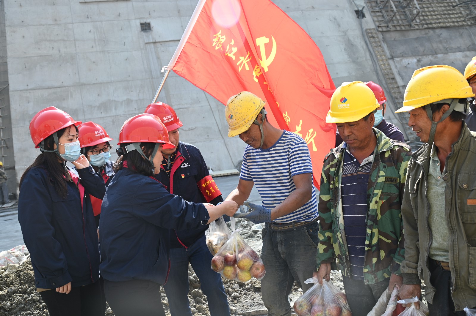 通過近日對(duì)施工班組的了解,為確保大江截流的目標(biāo)按期實(shí)現(xiàn),工人們中午、晚上用餐都是送到施工現(xiàn)場(chǎng)簡(jiǎn)單解決,11月9日,機(jī)關(guān)第一黨支部組織了以“工人在加班,我為工人送加餐”的主題黨日活動(dòng),組織支部黨員、預(yù)備黨員、入黨積極分子、志愿服務(wù)者共15人到導(dǎo)流明渠施工現(xiàn)場(chǎng),慰問在施工現(xiàn)場(chǎng)加班加點(diǎn)的一線工人,為他們送去了雞腿、蘋果等慰問品。