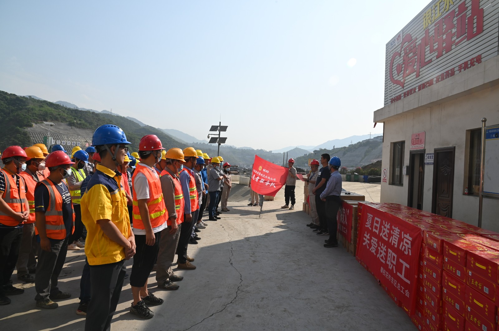 雖然是上午9點,但盛夏的烈日已炙烤著銀江水電站工地。在銀江水電站“愛心驛站”,汪慶元首先致敬全體工友烈日下的“銀江精神”,高度贊揚了一線建設者三年來為銀江水電站建設做出的積極貢獻,并鼓勵他們要戰(zhàn)勝高溫酷暑等重重難關(guān),堅守崗位完成工程建設任務。劉欣在講話中談到:東區(qū)工會心系工友,是大家的“娘家人”,希望大家保重身體,平安度夏,在落實安全防護的前提下積極工作,保質(zhì)保量推進項目施工,為攀枝花的經(jīng)濟建設做出更大的貢獻。