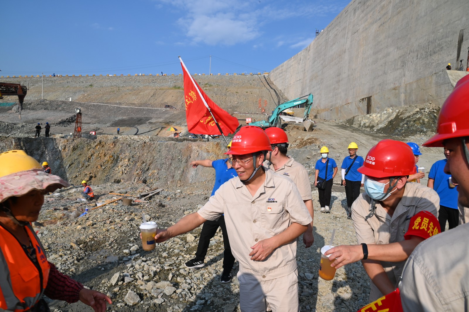 29日下午,泄水系統(tǒng)消力池首倉混凝土澆筑按期順利澆筑,工地慰問組的黨員同志,為工友們送上了精心熬制的綠豆湯,叮囑大家在炎炎烈日下開展混凝土澆筑注意防暑降溫。