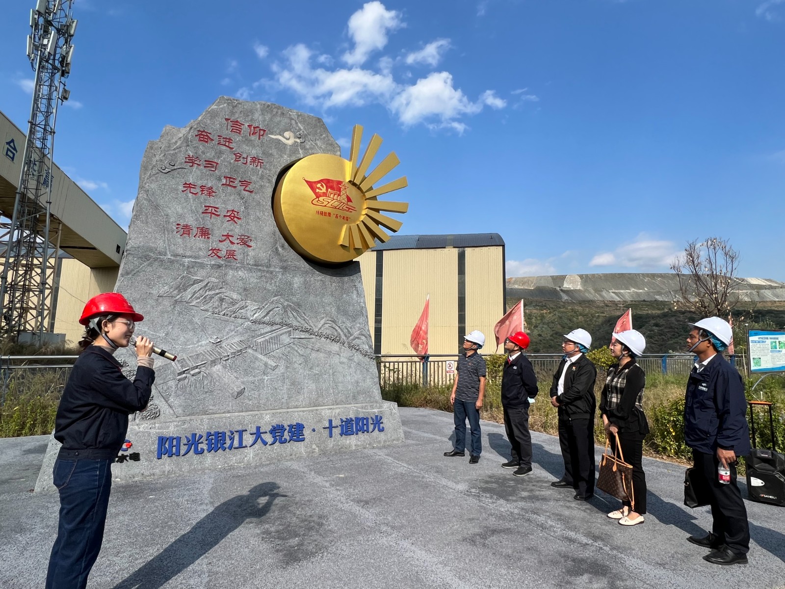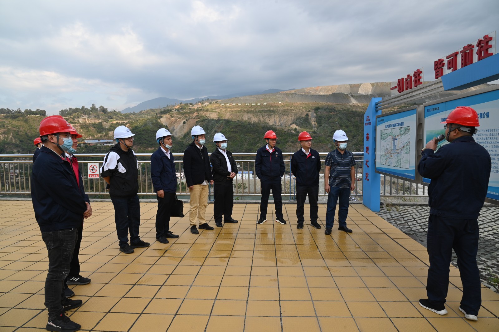 覃鳳荏一行首先來(lái)到銀江水電站施工現(xiàn)場(chǎng),參加了銀江水電站大壩首倉(cāng)混凝土澆筑活動(dòng)。在現(xiàn)場(chǎng)聽(tīng)取了銀江水電站工程整體規(guī)劃、建設(shè)意義、工期計(jì)劃等基本情況介紹,并參觀(guān)了鋼筋加工車(chē)間、試驗(yàn)室等地。隨后,覃鳳荏一行參觀(guān)了攀水電公司“七色陽(yáng)光大黨建”宣傳陣地,詳細(xì)了解了“十道陽(yáng)光行動(dòng)計(jì)劃”等內(nèi)容。