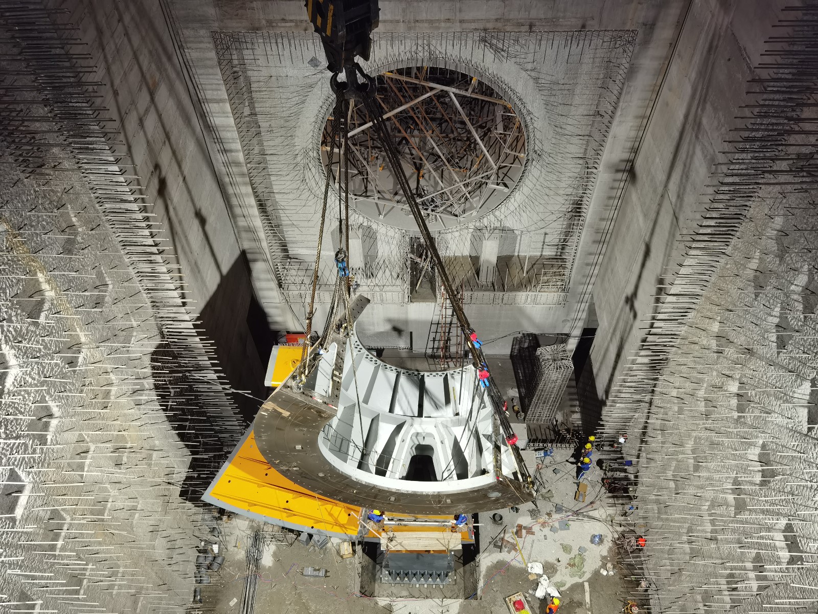 10月20日履帶吊車試吊驗(yàn)收及下固定導(dǎo)葉順利吊裝完成后,從20日16點(diǎn)開始至21日20:00結(jié)束,歷經(jīng)運(yùn)輸、翻身及吊裝三個(gè)階段長達(dá)18個(gè)小時(shí)工作,管形座最重件第一瓣內(nèi)殼在公司領(lǐng)導(dǎo)的現(xiàn)場指導(dǎo)下穩(wěn)穩(wěn)落至安裝位置,后續(xù)公司將組織參建單位一鼓作氣將首臺機(jī)組管形座剩余內(nèi)殼、外殼、前錐體及固定導(dǎo)葉等悉數(shù)吊裝到位,力爭年底完成安裝工作,為實(shí)現(xiàn)2025年一季度首臺機(jī)組投產(chǎn)發(fā)電目標(biāo)打下堅(jiān)實(shí)基礎(chǔ)。