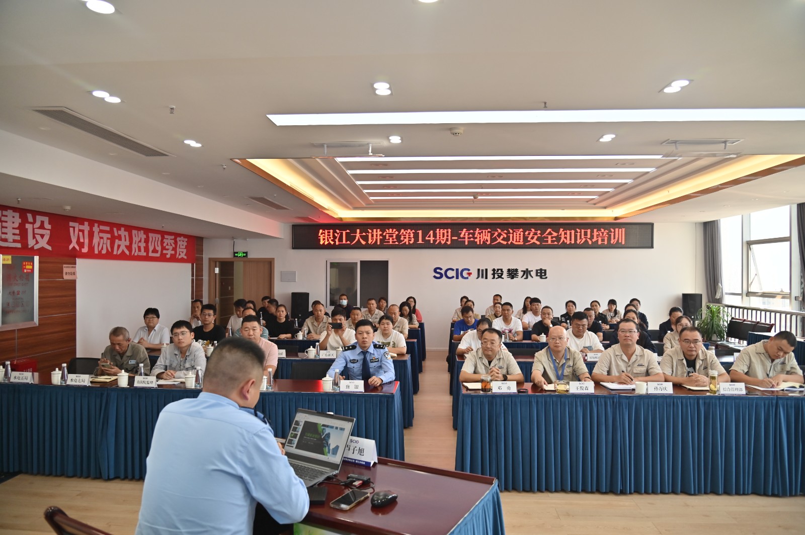 為全面做好銀江水電站安全生產(chǎn)各項(xiàng)工作,強(qiáng)化各單位安全生產(chǎn)工作主體責(zé)任意識(shí),切實(shí)做好車輛交通安全管理工作,10月23日,攀水電公司舉辦2023年第14期“銀江大講堂”——車輛交通安全專題培訓(xùn),邀請(qǐng)攀枝花市交警支隊(duì)三大隊(duì)事故民警唐銀、宣傳民警盧子旭主講,公司在攀領(lǐng)導(dǎo)、各部門員工、各參建單位有關(guān)管理人員及駕駛員共計(jì)50余人參加。