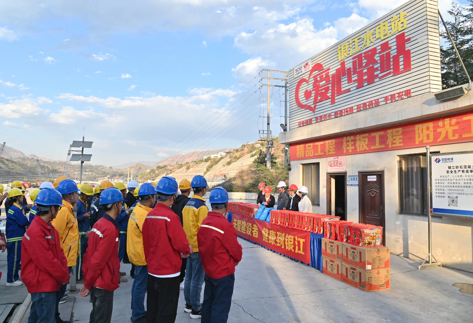 活動(dòng)首先參觀了公司大黨建宣傳陣地和銀江水電站施工現(xiàn)場(chǎng)。在愛(ài)心驛站,黨員們?yōu)閬?lái)自長(zhǎng)江設(shè)計(jì)院、貴陽(yáng)院監(jiān)理部、水電五局項(xiàng)目部、水電七局項(xiàng)目部、廣東源天項(xiàng)目部等參建單位的工友發(fā)放了健康宣傳手冊(cè)、新春大禮包等慰問(wèn)物品。田巨龍感慨到銀江水電站工程建設(shè)速度之快難以令人想象,囑咐工友們一定要保重身體、注意自身防護(hù),祝福工友們平平安安、健健康康迎接新年的到來(lái)。
