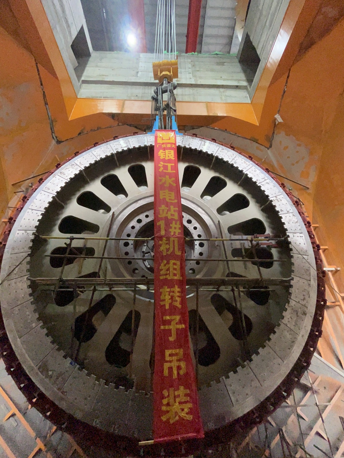 8月25日下午,銀江水電站首臺(tái)機(jī)組轉(zhuǎn)子順利吊入機(jī)坑并與機(jī)組主軸連接就位。