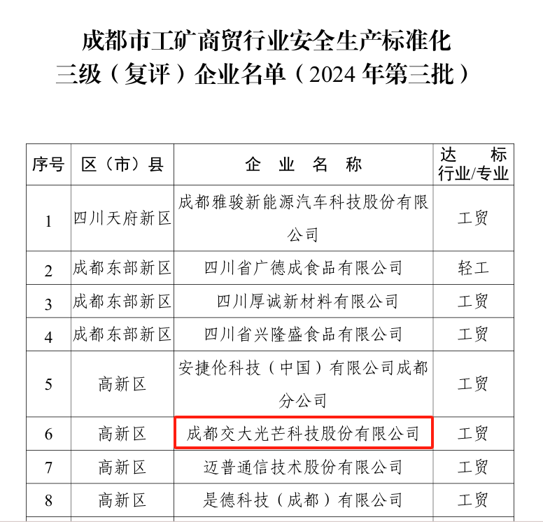 2024年9月,成都市應(yīng)急局發(fā)布《關(guān)于公布成都市工礦商貿(mào)行業(yè)安全生產(chǎn)標準化三級(復(fù)評)企業(yè)名單(2024年第三批)的通知》,交大光芒通過安全生產(chǎn)標準化三級達標復(fù)評。