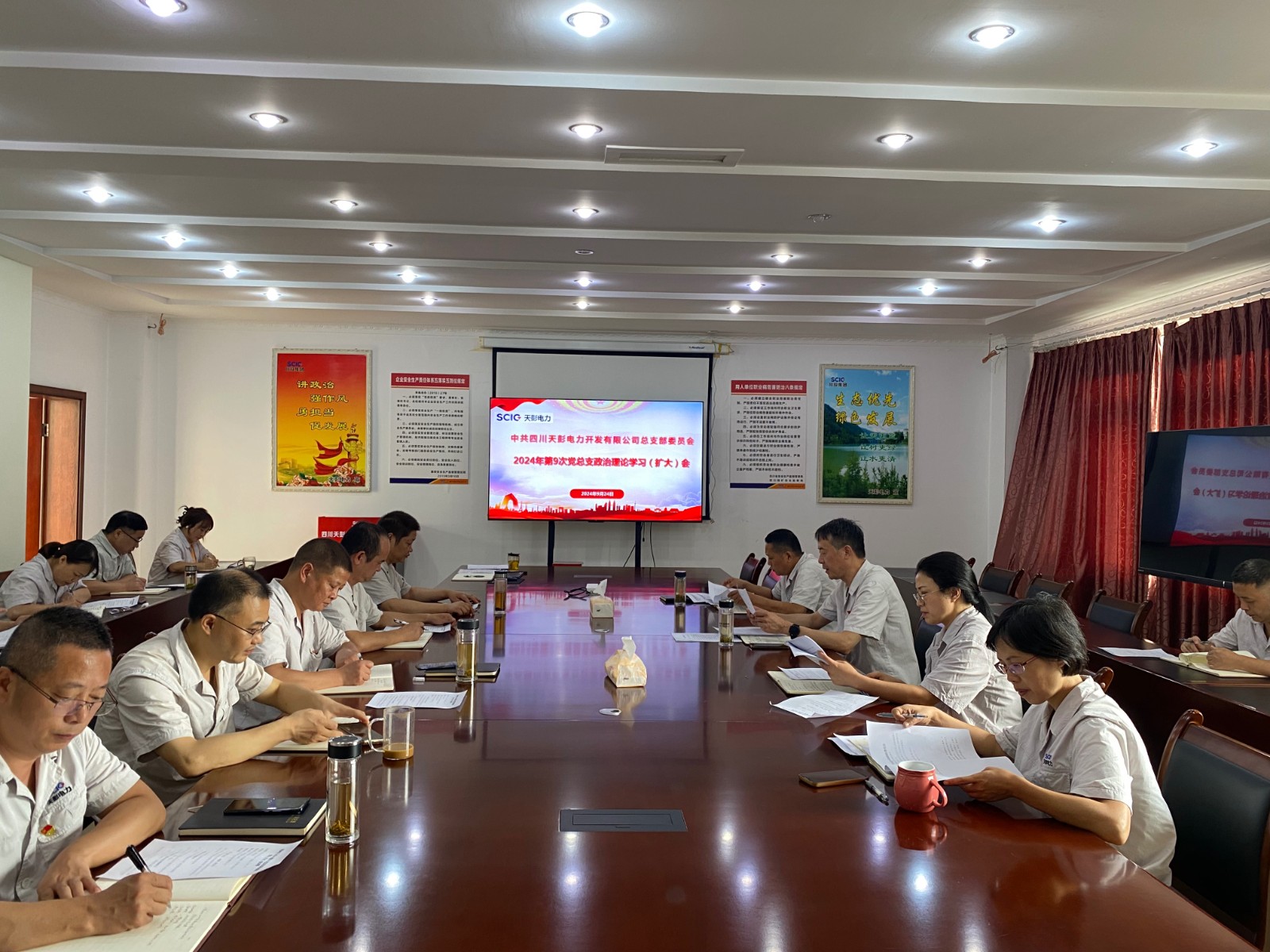 近日,天彭電力黨總支召開2024年第9次黨總支政治理論學(xué)習(xí)(擴(kuò)大)會議,集中學(xué)習(xí)省委十二屆六次全會精神,研究公司貫徹落實(shí)舉措。公司黨總支書記、執(zhí)行董事、總經(jīng)理劉紅兵主持,領(lǐng)導(dǎo)班子成員、黨員、干部、關(guān)鍵崗位人員參加學(xué)習(xí)。