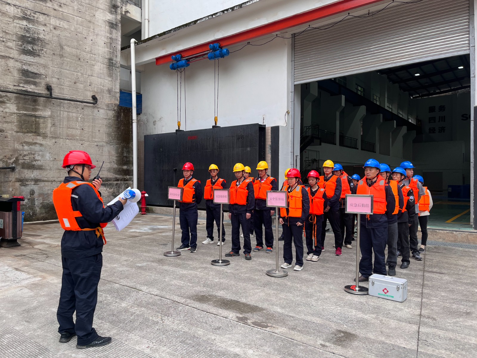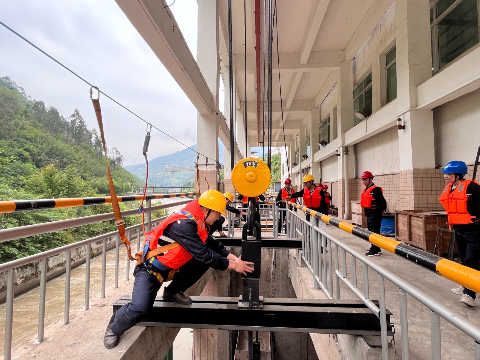 演練前,電廠組織全員學(xué)習(xí)了《玉田電廠2025年防洪度汛應(yīng)急演練方案》,演練于14時(shí)30分正式開始,模擬玉田電廠三臺機(jī)組帶負(fù)荷93MW,越西縣氣象部門發(fā)布暴雨橙色預(yù)警,越西縣降暴雨已持續(xù)數(shù)小時(shí)。上游宏陽電站和團(tuán)結(jié)電站準(zhǔn)備停機(jī)避峰已開閘放水,尼日河道來水兇猛,預(yù)計(jì)來水流量達(dá)到800m3/s,閘首水位1274.5m的緊急情況。當(dāng)值值長接到汛情后,迅速匯報(bào)防汛辦負(fù)責(zé)人。防汛辦負(fù)責(zé)人要求控制好水位,確保人員安全,并準(zhǔn)備停機(jī)避峰。隨后,險(xiǎn)情立即上報(bào)至防汛總指揮,總指揮接到險(xiǎn)情后,立即啟動《玉田電廠防汛搶險(xiǎn)應(yīng)急預(yù)案》,成立現(xiàn)場指揮部,統(tǒng)籌調(diào)度防汛辦公室、安全督導(dǎo)組、應(yīng)急搶險(xiǎn)組、應(yīng)急后勤組等多支隊(duì)伍。大壩值班人員接到通知后拉響防洪警報(bào),開啟沖砂閘和泄洪閘緩慢放水,控制水位,同時(shí)做好防汛物資準(zhǔn)備,并啟動柴油發(fā)電機(jī)。當(dāng)班值長向調(diào)度申請停機(jī)避峰,并及時(shí)向相關(guān)部門及下游電站通報(bào)汛情。三臺機(jī)組停機(jī)后,逐步開啟沖砂閘和泄洪閘進(jìn)行泄洪。應(yīng)急搶險(xiǎn)組完成了廠房柴油發(fā)電機(jī)啟動試驗(yàn),落下機(jī)組尾水閘門,關(guān)閉主廠房防洪門并堆砌防洪沙袋。運(yùn)行值班人員加強(qiáng)設(shè)備和邊坡巡查。后勤組負(fù)責(zé)人員疏散和后勤保障工作。各小組協(xié)同作戰(zhàn),演練于15時(shí)49分圓滿結(jié)束。