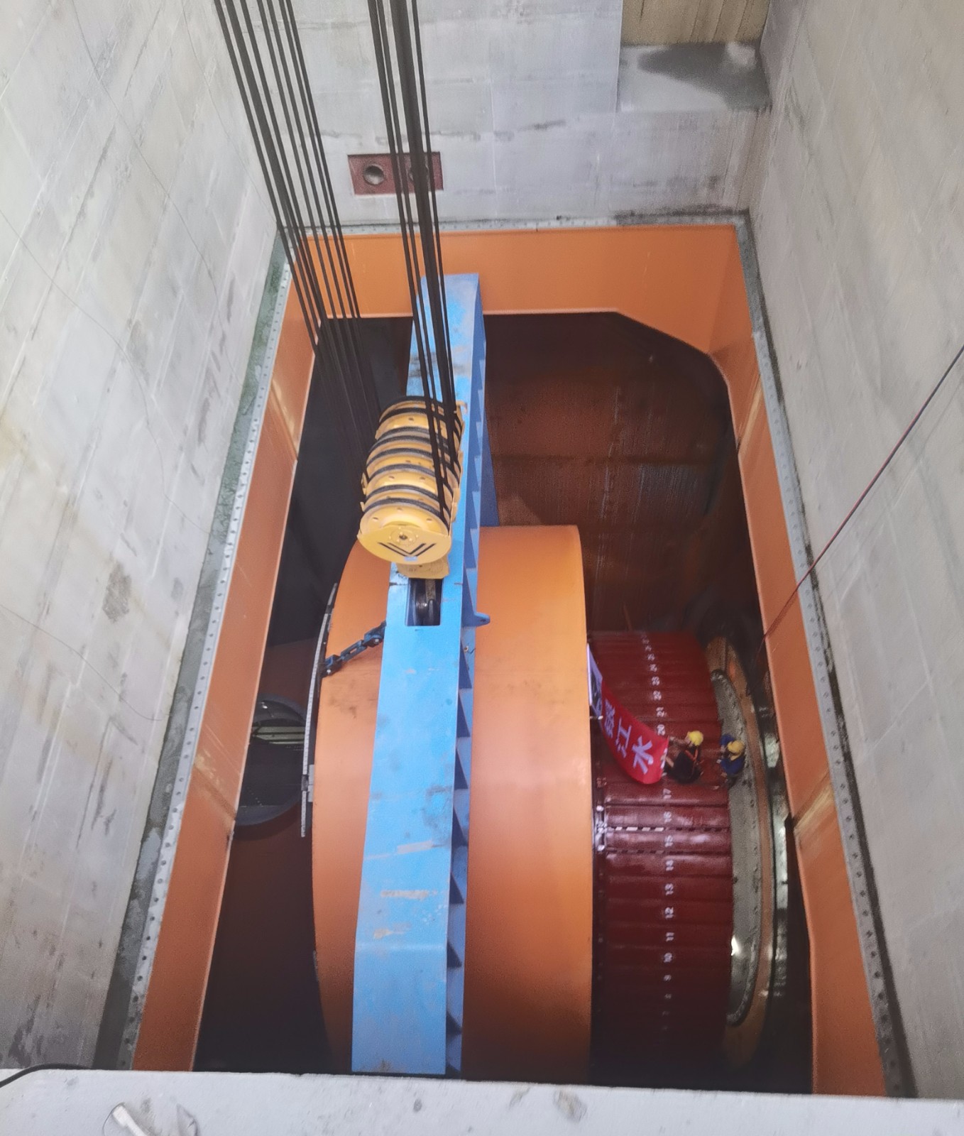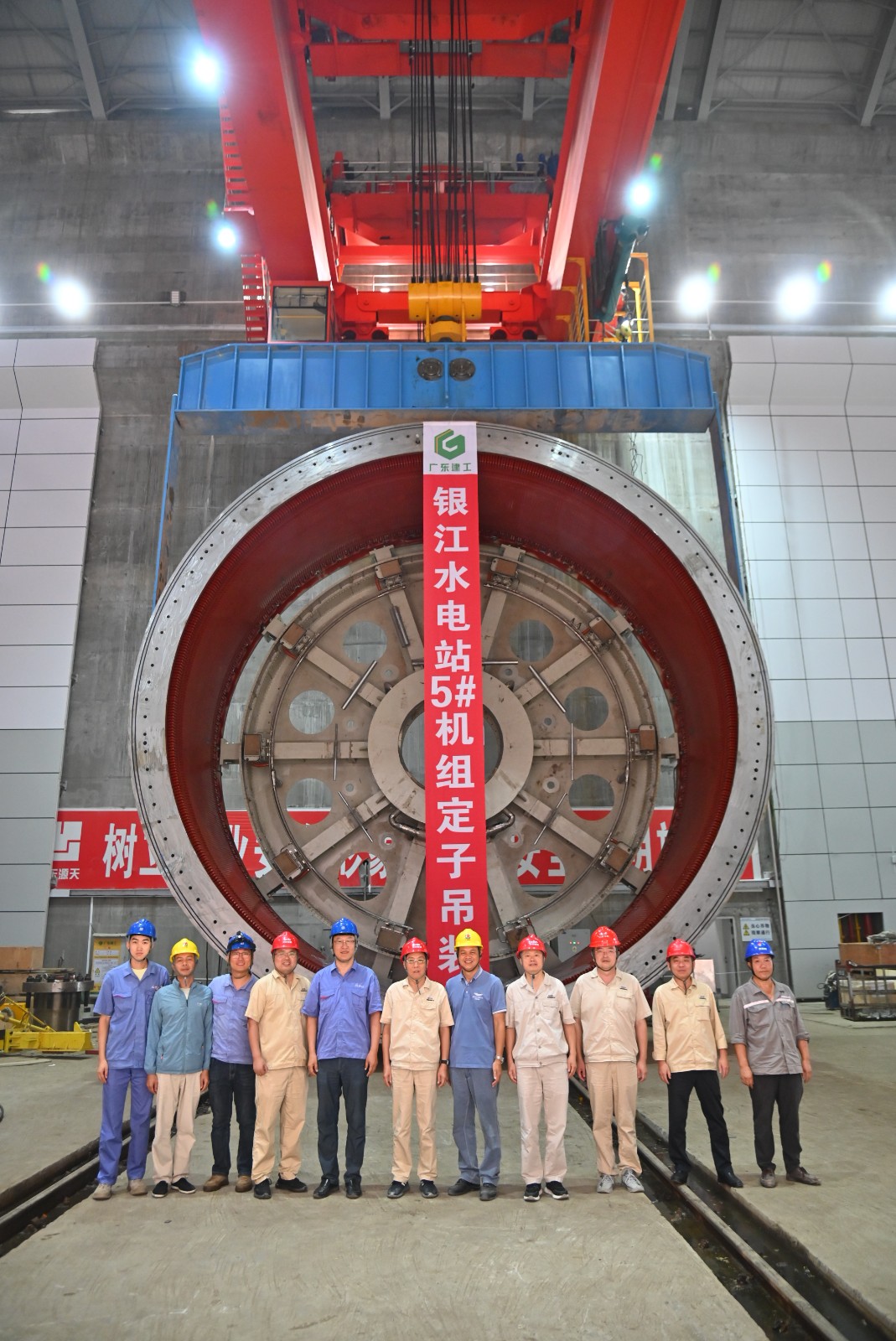 轉(zhuǎn)子與定子均是水輪發(fā)電機組核心部件,其裝配精度要求極高,本次吊裝過程堪稱機組安裝中技術(shù)最復(fù)雜、風險最高的環(huán)節(jié)之一;轉(zhuǎn)子總重約230.5噸,最大安裝直徑達8473.2毫米,由轉(zhuǎn)子支架、磁極、制動環(huán)及轉(zhuǎn)子引線等部件精密組裝而成;定子裝配則包括機座、內(nèi)支撐、鐵芯、線棒等,總重190.5噸,機座最大外徑達10400毫米,總起吊重量高達約228噸;為確保這兩個大件的吊裝工作萬無一失,攀水電公司協(xié)同參建各方提前周密部署,對橋機制動系統(tǒng)、吊具及轉(zhuǎn)子、定子本體狀態(tài)開展全維度細致檢查,同步落實現(xiàn)場安全技術(shù)交底,完成起吊設(shè)備調(diào)試、操作流程演練等準備工作,夯實安全基礎(chǔ)。