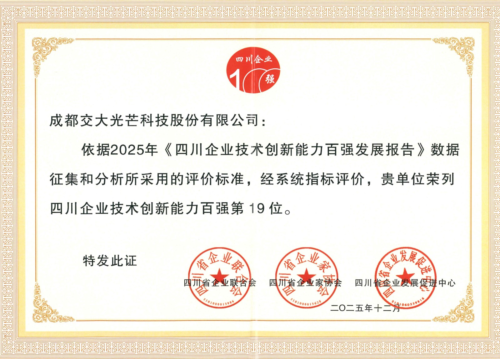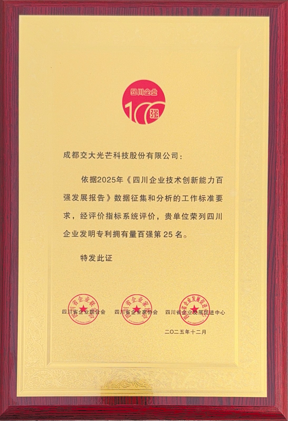 近日,2025年四川企業(yè)技術(shù)創(chuàng)新發(fā)展大會在成都召開,川投能源所屬交大光芒公司獲評四川企業(yè)技術(shù)創(chuàng)新能力百強企業(yè)(第19位)和四川企業(yè)發(fā)明專利擁有量百強企業(yè)(第25位),這是交大光芒連續(xù)四年榮獲“雙百強”企業(yè),公司首席專家、副總經(jīng)理陳奇志獲評“2025年四川企業(yè)技術(shù)創(chuàng)新突出貢獻(xiàn)人物”。