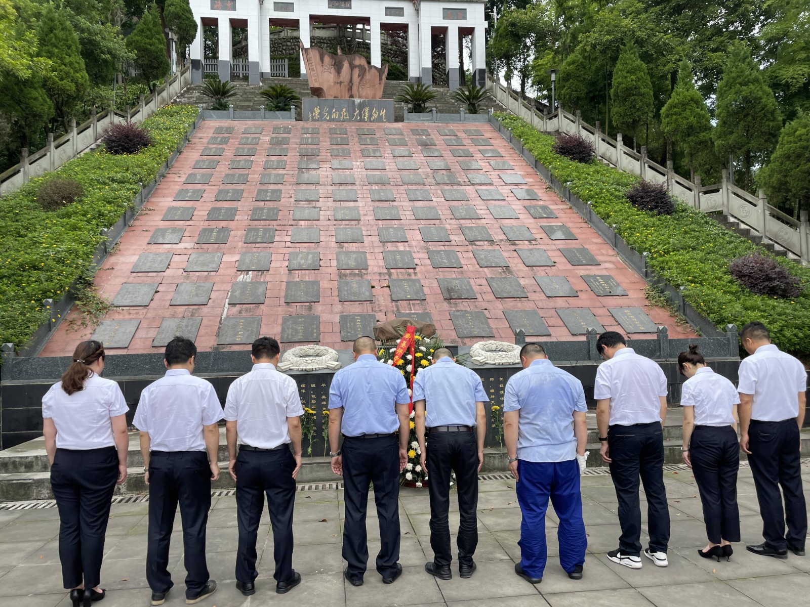 儀式后,全體黨員參觀了烈士陵園。烈士陵園內(nèi),松柏蒼翠挺拔,烈士紀(jì)念碑巍然聳立,氣氛莊嚴(yán)肅穆。天全縣烈士陵園,是為了紀(jì)念1935年10月7日至1936年2月15日中央紅軍在天全白土坎犧牲的紅軍烈士而修建的,共有316名先烈長眠于此。在300名英烈群墓旁就是修建二郎山公路時(shí)犧牲的16民烈士的公墓,二郎山隧道曾是千里川藏公路上的第一道咽喉險(xiǎn)關(guān),素有“千里川藏線,天塹二郎山”之說,硬生生開鑿出一條道路,也付出了慘痛的代價(jià),平均每公里就要犧牲七名戰(zhàn)士。