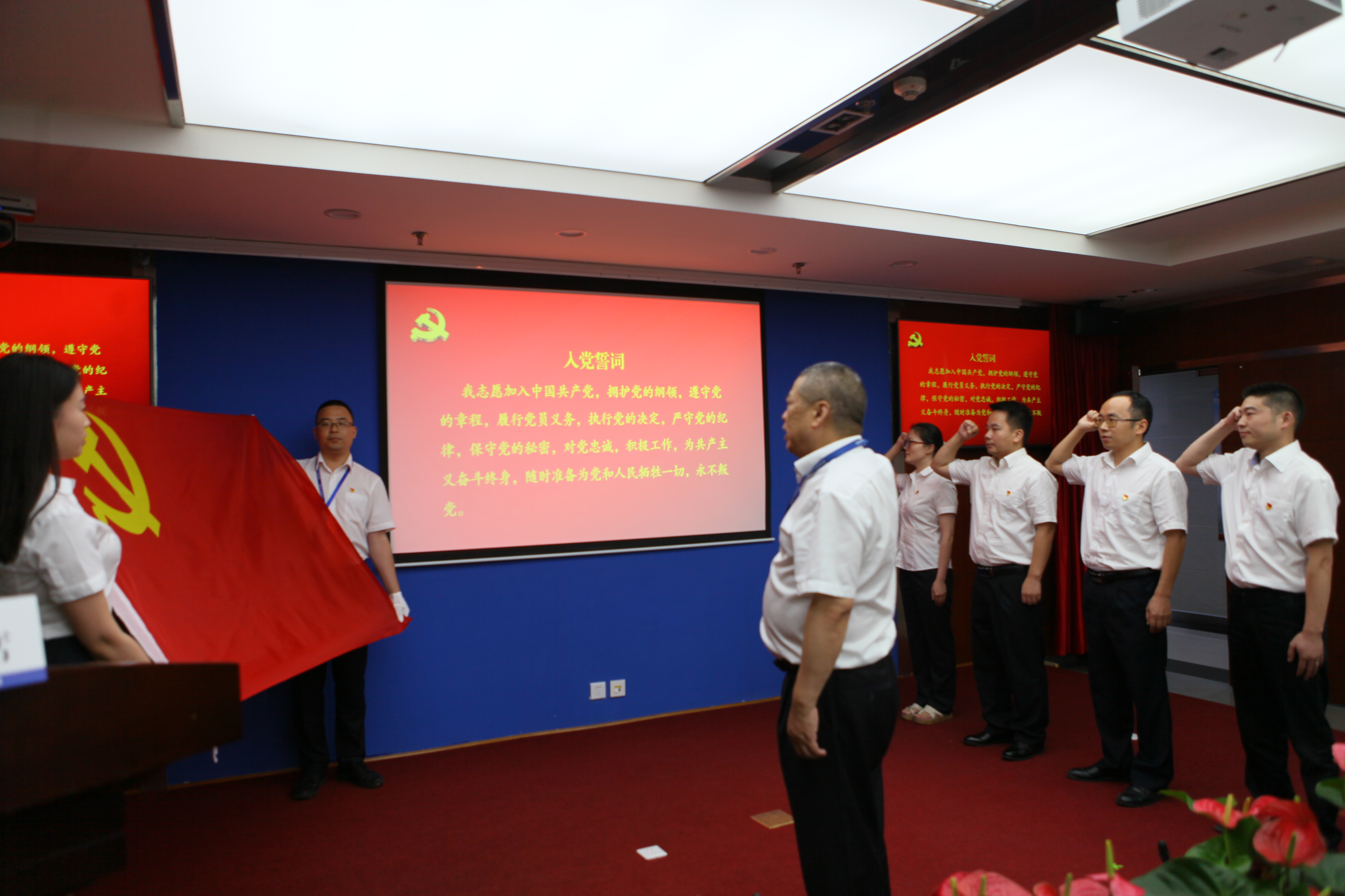 會議在雄壯的國歌中拉開序幕。與會黨員和新黨員代表在公司黨委書記、副董事長、總經理楊洪同志的帶領下,舉起右拳,面向鮮紅的黨旗莊嚴宣誓。鏗鏘有力的誓言在耳邊久久回蕩,讓新老黨員進一步堅定了入黨信念,增強了黨性意識,鞭策和激勵著大家履職盡責、干事創(chuàng)業(yè),以新氣象、新作為兌現對黨的莊嚴承諾。