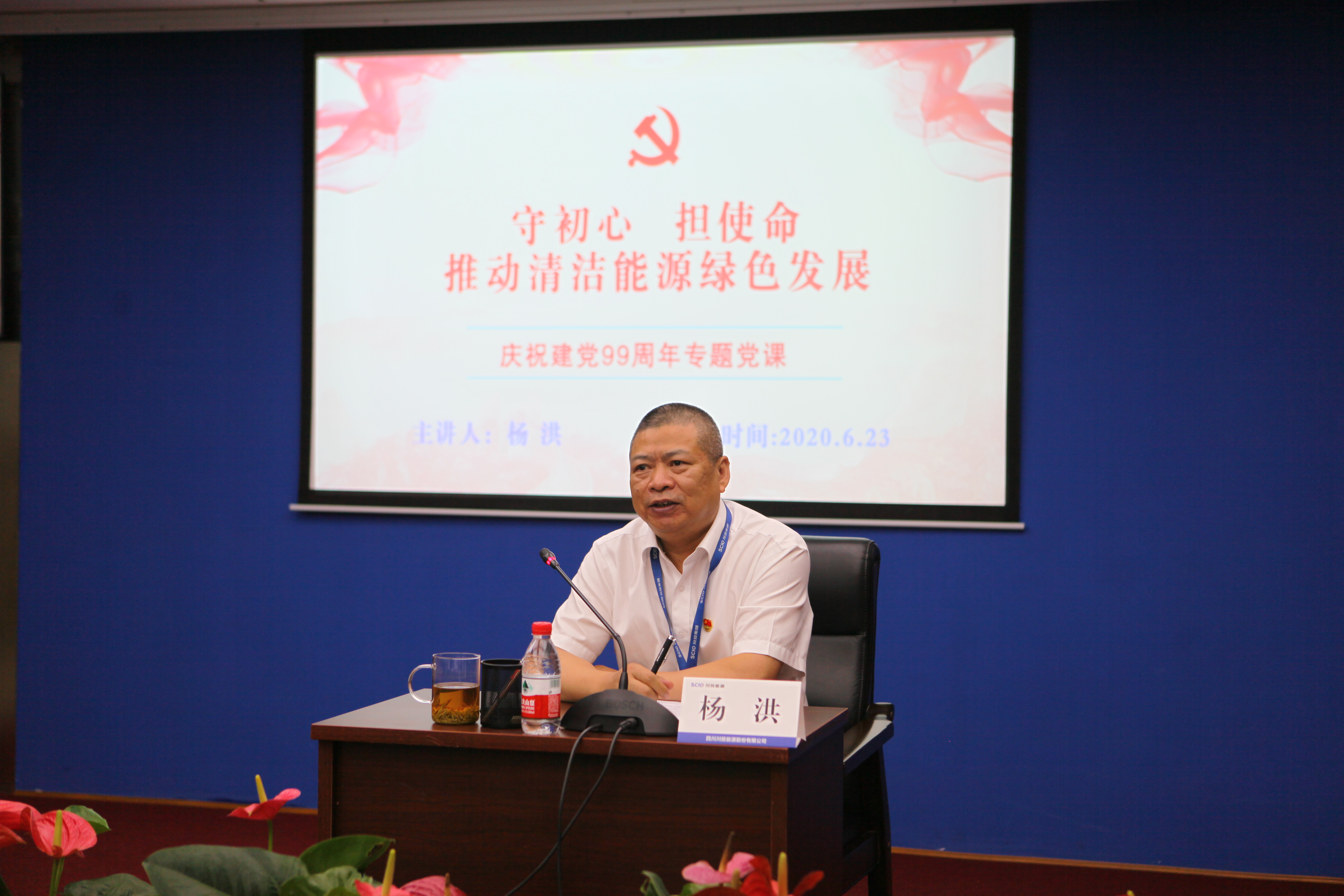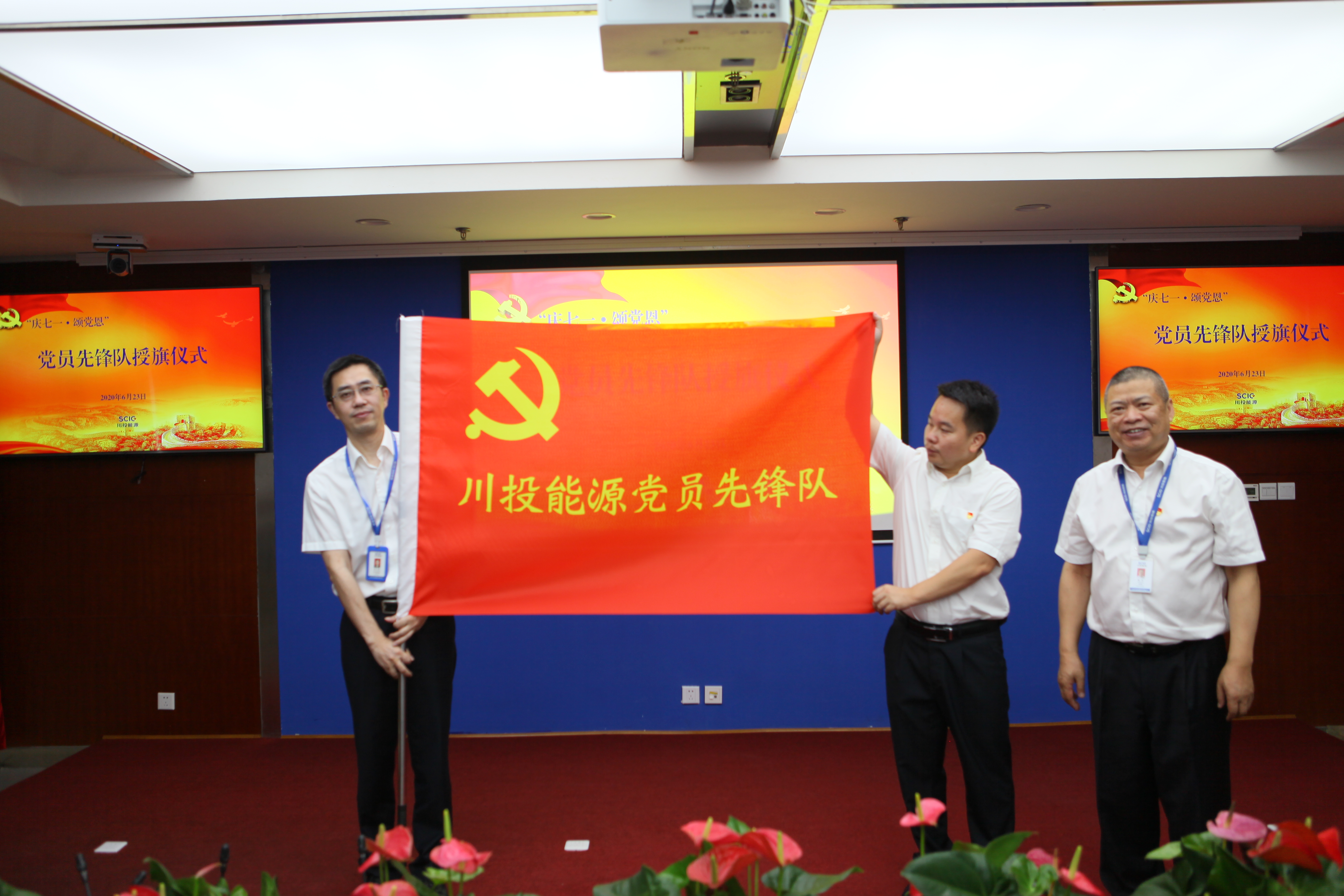 值此川投能源“紅色引擎藍籌先鋒”(簡稱“五個先鋒”)黨建品牌創(chuàng)建工作引向深入之際,6月23日,川投能源黨委采用現場和視頻會議相結合的方式,以黨員承諾踐諾、黨員先鋒隊授旗、發(fā)布公司黨建品牌標識以及公司黨委書記講黨課等內容為載體,組織全體黨員、入黨積極份子、新黨員代表隆重召開紀念建黨九十九周年大會,為中國共產黨第99個生日獻上賀禮。公司黨委副書記、工會主席楊超龍主持會議。